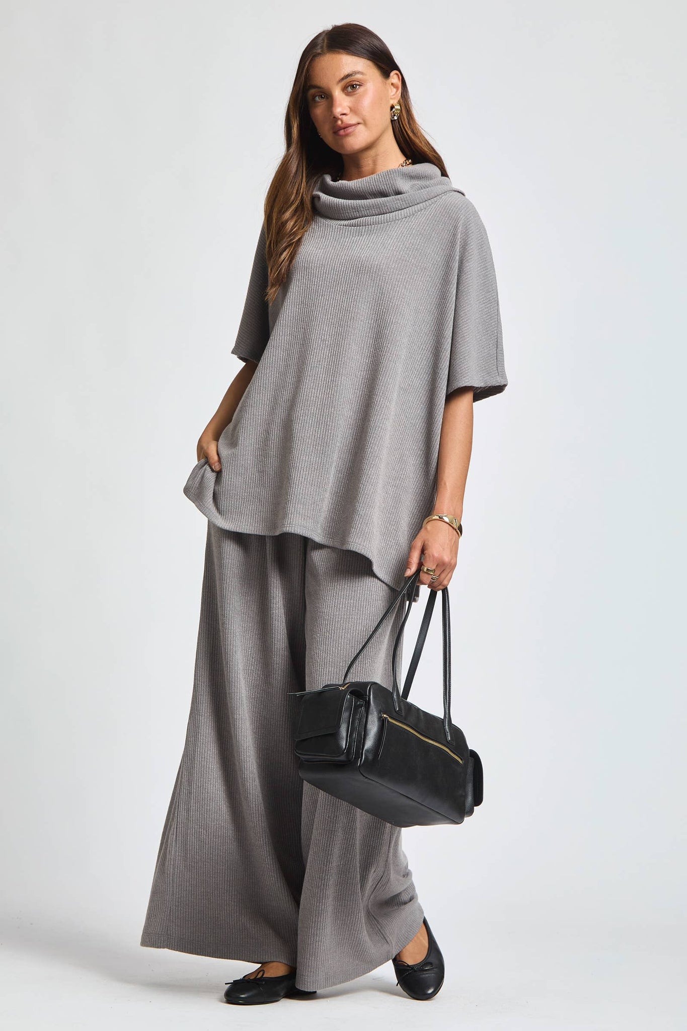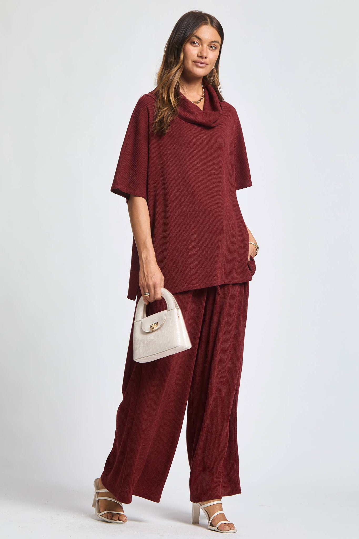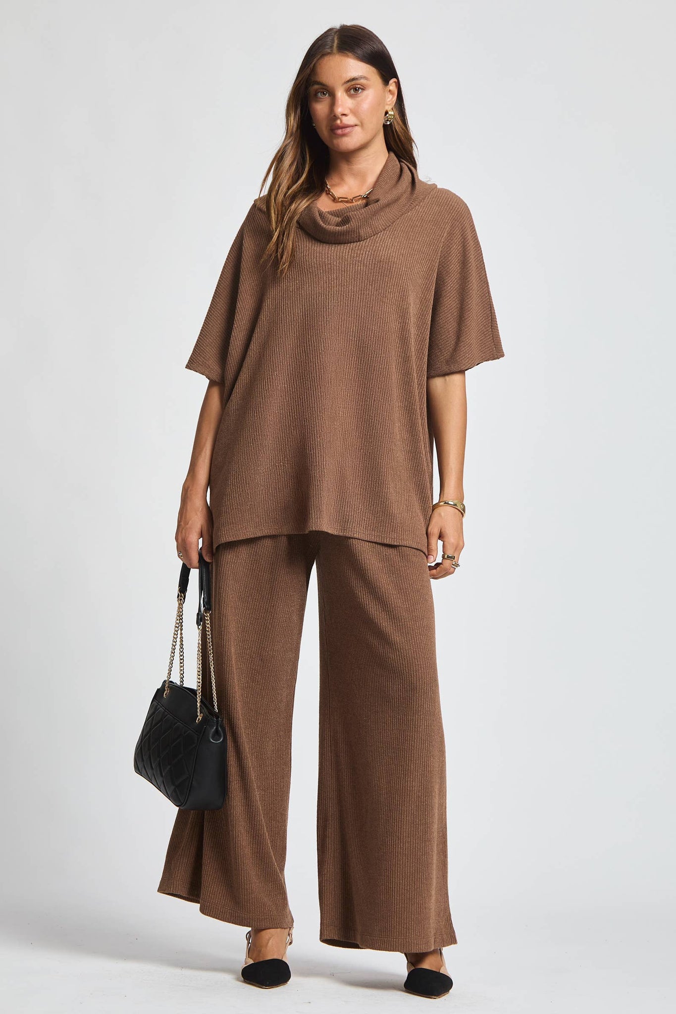 "Cozy up in effortless style with our Cowl Neck Top + Relaxed Pants 2 Piece Set. The soft cowl neck poncho top and relaxed pants make for a comfortable and elevated loungewear/travel look. Why settle for ordinary when you can have extraordinary comfort?"